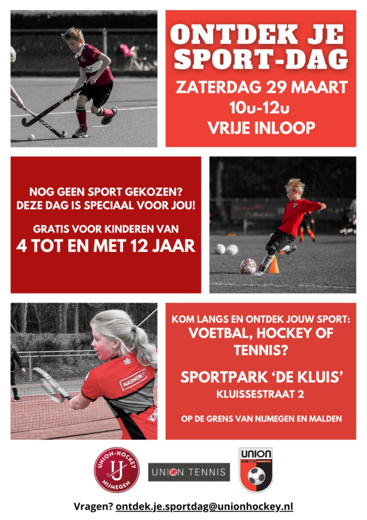 Zaterdag 29 maart wordt een dag vol plezier en beweging voor kinderen. Union Voetbal, Union Hockey en Union Tennis organiseren samen een sportdag die je niet wilt missen. Het is de perfecte gelegenheid om te ontdekken welke sport jouw kind het leukst vindt!